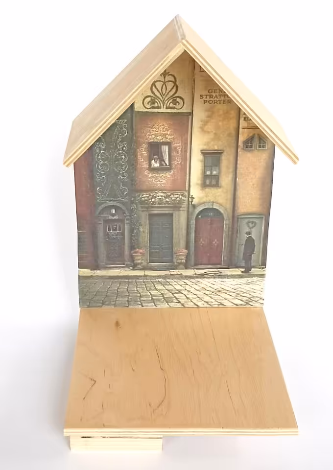 Wykonana ze sklejki i drewna,ozdobiona książkowym obrazkiem.
